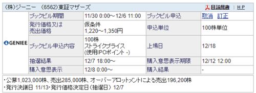 こんばんは。 3日連続のIPOのブックビルディングですよ。今日も3銘柄。毎日言ってる分散させましょー。今日も単純にブックビルディングの記録です。忘れないためのエントリです。 さてさて、今日のブックビルディングです。 6562ジーニー 主幹事は野村證券…