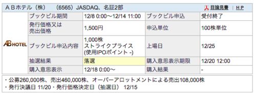 こんばんは。 今日の当落発表で今年のIPOの当落確認はすべて終了ですね。11月末から続いたIPOの落選ラッシュでIPOチャレンジポイントがしっかりと貯まっています。 6565ABホテル こちらからはブックビルディング。主幹事は大和証券。 ジャスダックに上場予…