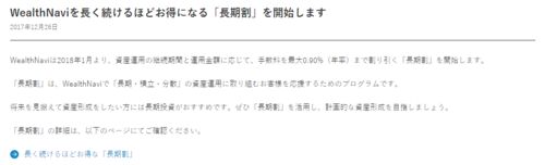 こんばんは。 WealthNaviからなにやら「長期割」なるものが発表されています。資産運用を継続した期間と運用金額に応じて、6カ月ごとに手数料の割引が拡大していき、最大0.90%(年率)まで割り引きがされるようです。もともと積み立てを開始したら辞めるつも…