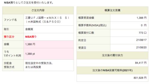TポイントでeMAXIS Slim米国株式(S&P500)を追加購入(2021年8月)