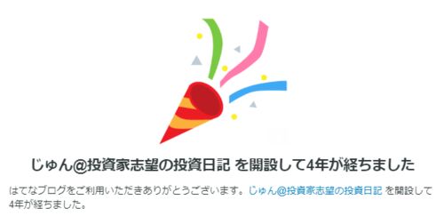 こんばんは。 毎年記念日メールをはてなブログから頂いていましたが、4年目以降は頂けなくなりましたが、この画像は気に入っているのでそのまま継続です。 (※これは3年前の記念日メールです) ブログを開設して7年が経ちました 毎月SBI証券でNISA枠で毎…