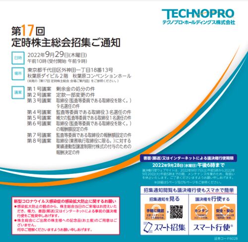 テクノプロ・ホールディングスより第17回定時株主総会招集通知が届きました