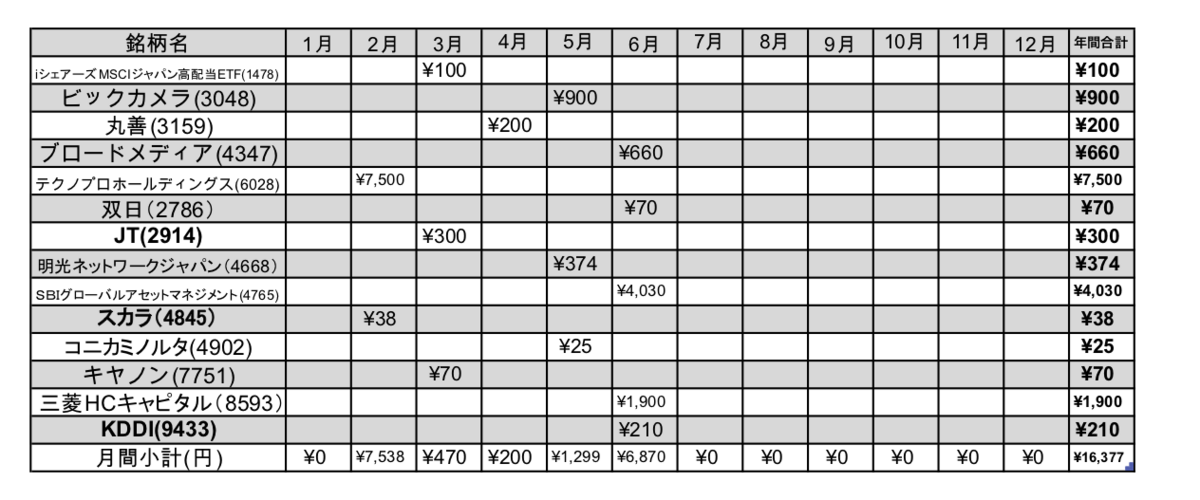 SMBC日興證券の特定口座、SBI証券の特定口座とNISA口座での保有している国内株です。5月、6月で8銘柄からちゃりんと受領しています。