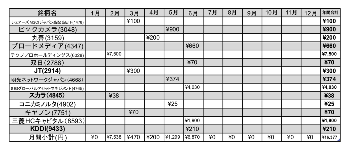 SMBC日興證券の特定口座、SBI証券の特定口座とNISA口座での保有している国内株です。7月は配当金の受け取りはありません。例年、8月も配当金の銘柄は少ないんですよね。