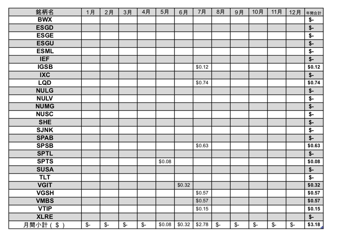 毎月月末にコツコツ入力をしている配当・分配金です。