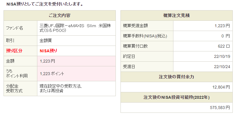 TポイントでのeMAXIS Slim米国株式(S&P500)積み立ては42回目になります。貯まっているTポイントの範囲内での積立投資なので、毎月手動で発注作業が必要ですが、慣れるとポイントを投資信託に交換するだけの簡単な作業です。以前、NISA枠で購入するのを間違えたことがあるので、注文を出すときは慎重になっています。