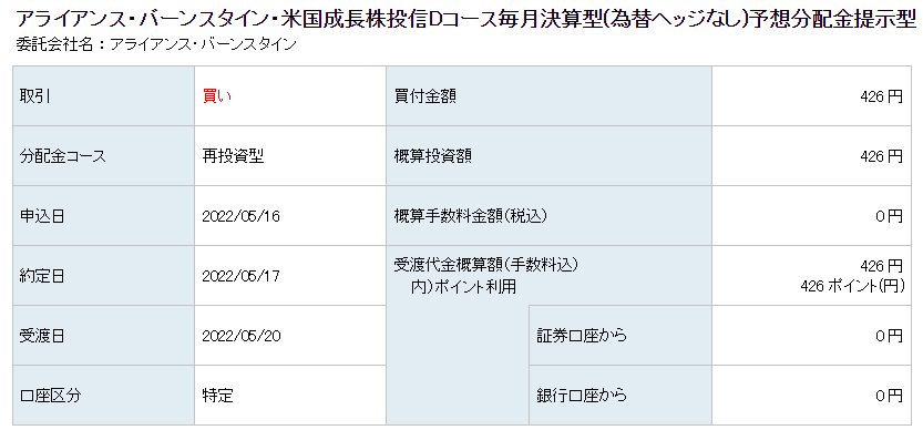 楽天スーパーポイントでAB・米国成長株投信Dコース(H無)を追加購入