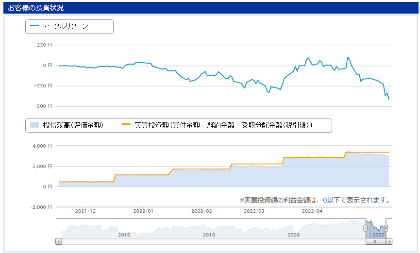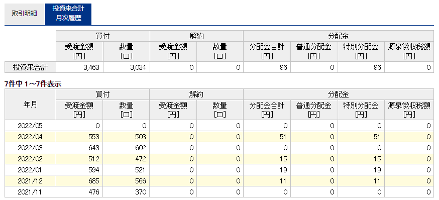 11月から運用開始し、15日決算のため12月から分配金を受領開始しています。5月分はまだ反映されていませんが、基準価額を見ると今月は0回答になりそうですね。