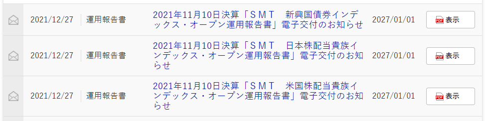 保有している投資信託から運用報告書が届きました。SMTシリーズの新興国債券、日本株配当貴族、米国株配当貴族の3銘柄です。