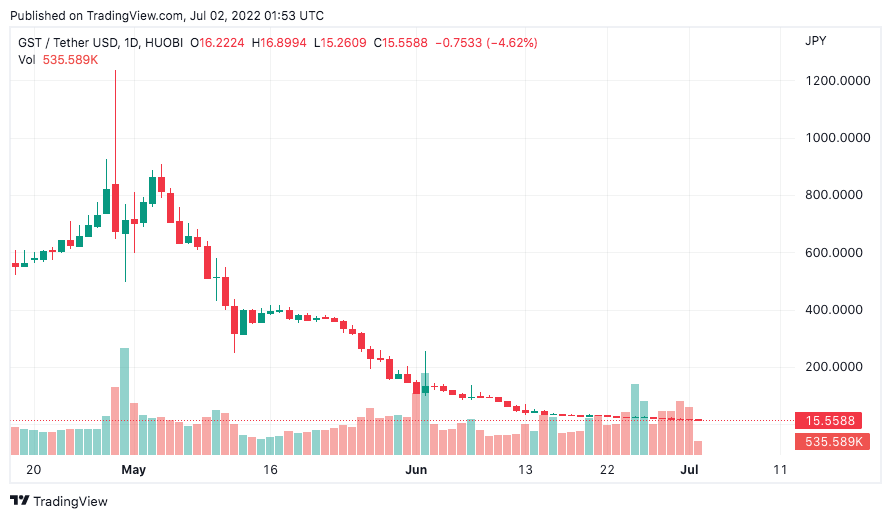 STEPNで歩くともらえるGSTは今週も下落一直線。15円台に突入です。