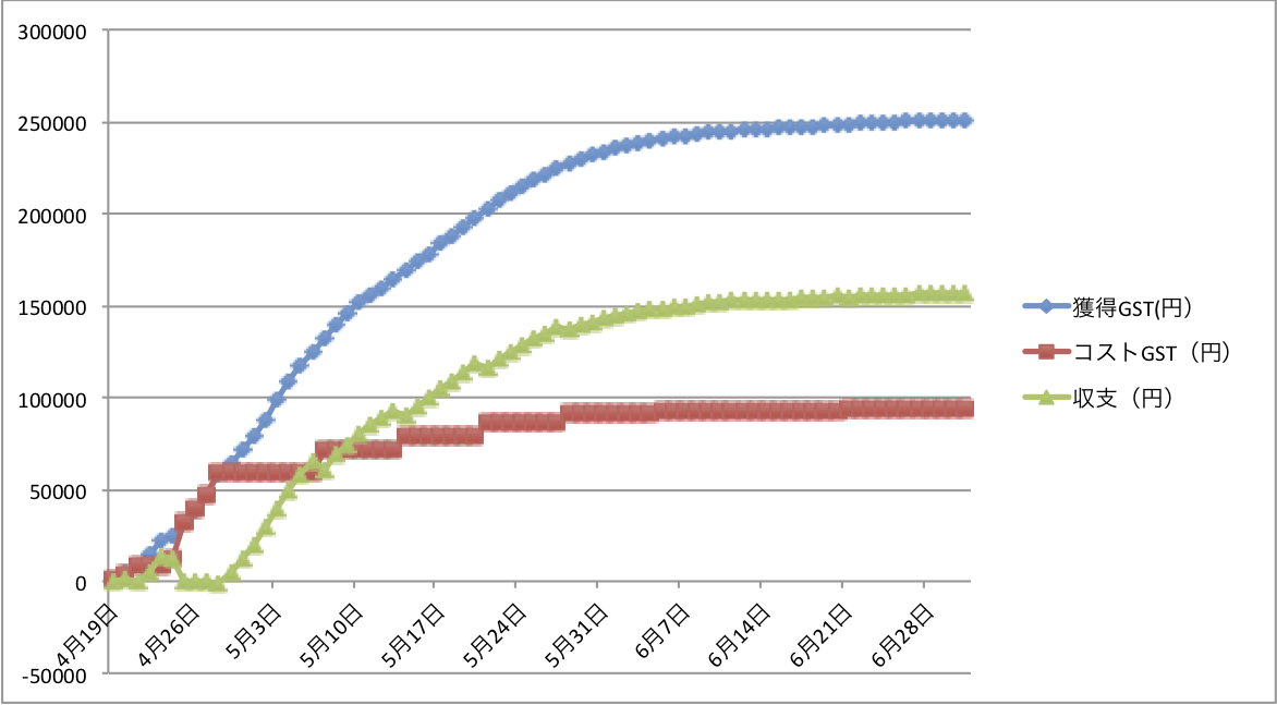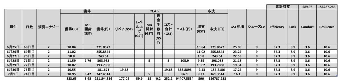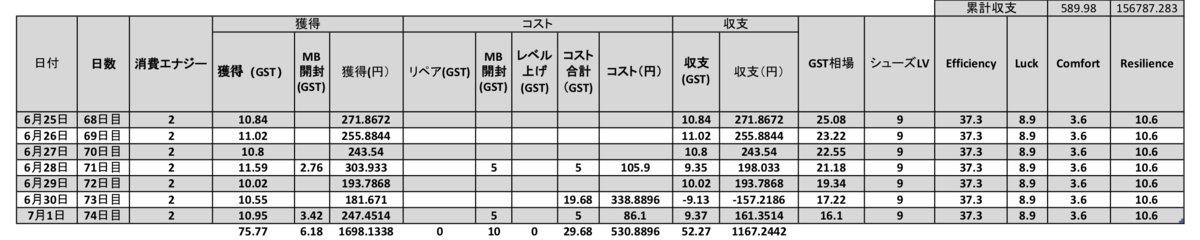 レベル上げも止め、ただ歩いてGSTを貯め続けている9週間ですが、原資回収は非常に厳しくなりました。必要最低限のリペア、MBの開封以外はGSTを消費することなく、毎週1度だけリペアを行い、ただただ歩いています。