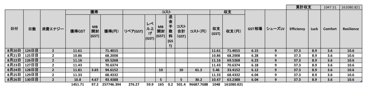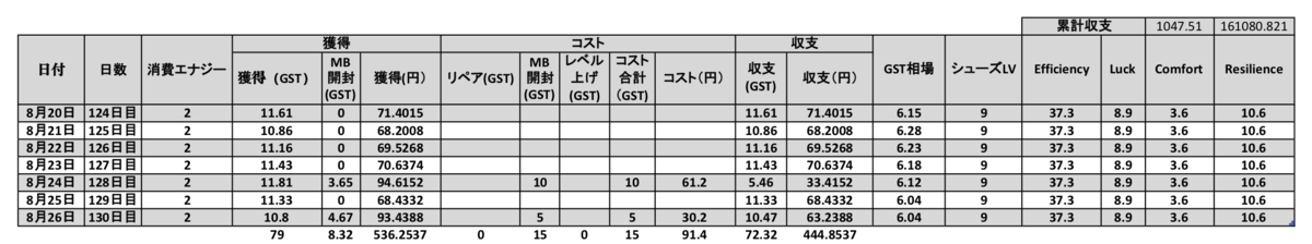 レベル上げも止め、ただ歩いてGSTを貯め続けている状態ですが、原資回収は相変わらず非常に厳しくなりました。必要最低限のリペア、MBの開封以外はGSTを消費することなく、毎週1度だけリペアを行い、ただただ歩いています。