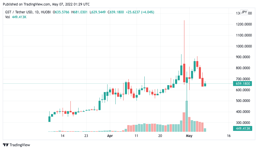 先週はSTEPNで歩くともらえるGSTが高騰しました。一時1,200円、上のグラフの超絶上髭のところですが、その時は10分歩いて1万円の世界でした。まぁ、こんな甘い相場が続くはずもなくですね。一時は500円近辺半値まで1日で落ちましたが、今日は650円前後で推移しています。