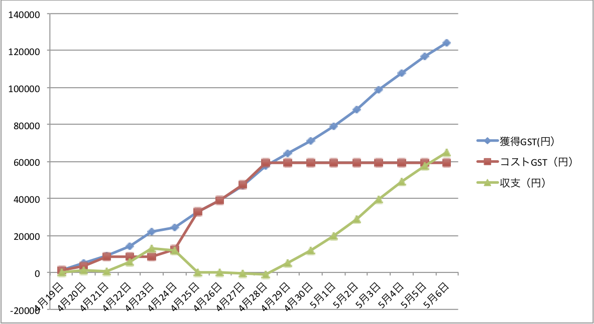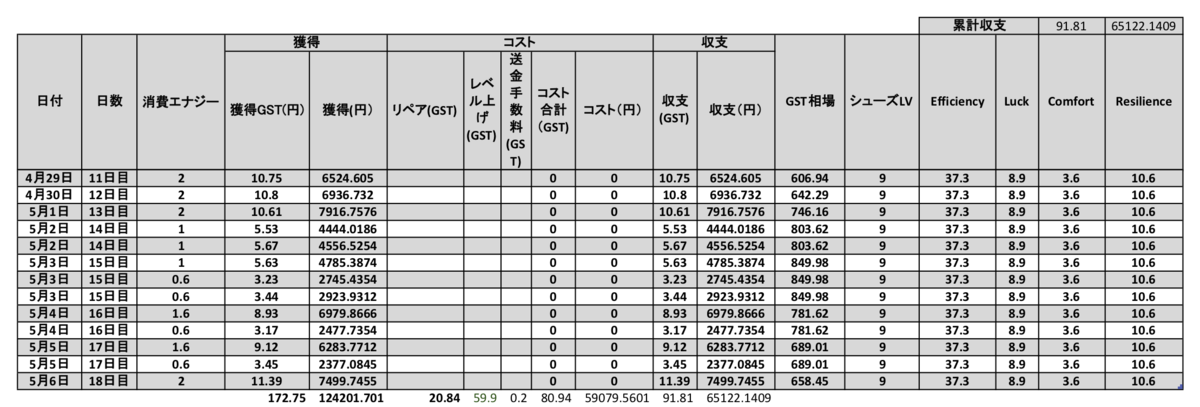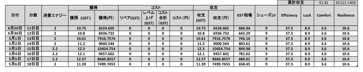 さてさて、GWに入った29日(金)から6日(金)までの確認になります。シューズを買うために18万円を投じているので、まずは原資回収をしたいところです。先週はシューズのリペアや次のレベル上げでコストがかさみましたが、今週は一度もリペアもレベル上げも行わず、GSTを頂き続けました。