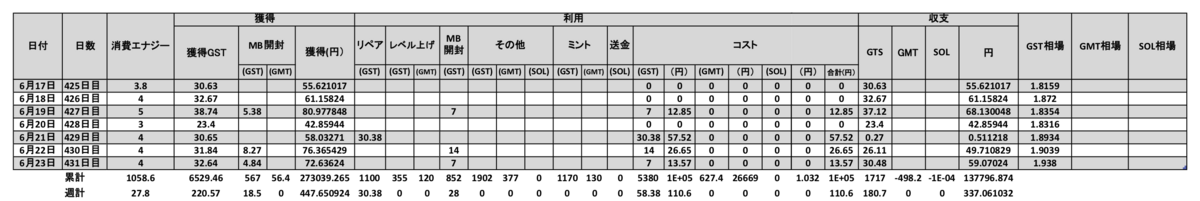 レベル上げは行わずに、リペアを1回、HP回復はなし、MB開封を4回となりました。eGSTの値動きが羨ましい限り。まぁ、その分靴の価格も桁違いに高いですけどね。