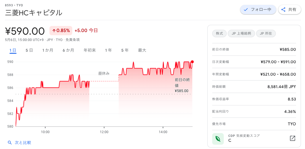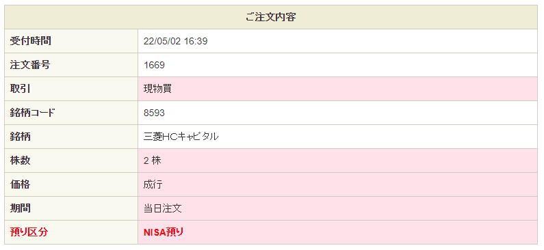 明日からは長期連休後半戦に入りますが、いつもと変わらず月初の単元未満株の注文を行いました。今回も同じく三菱HCキャピタル(8593)の追加注文です。