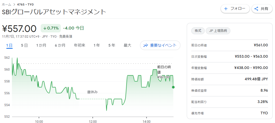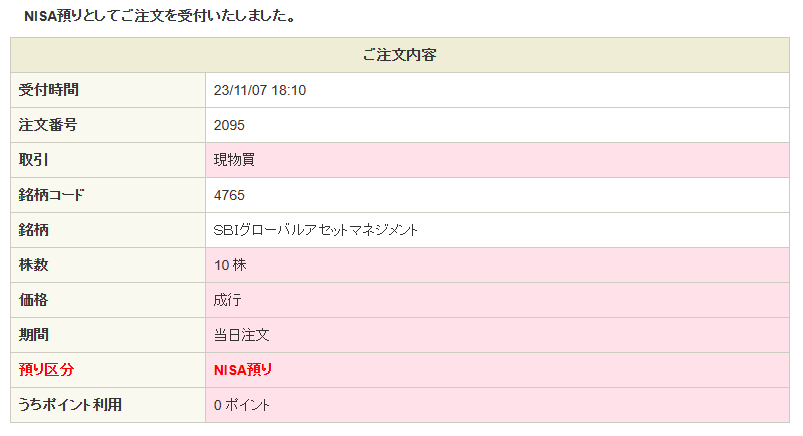このルールからは外れていますが、株主優待目的にSBIグローバルアセットマネジメントを不定期に購入します。