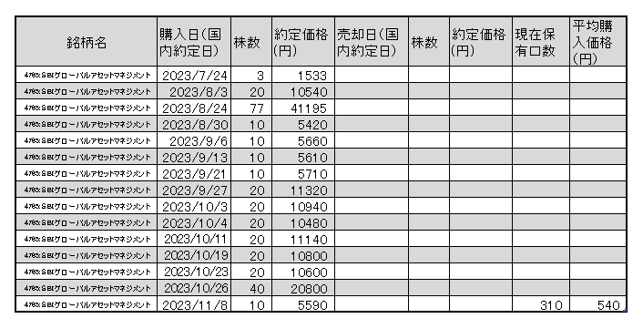 7月末からせっせと購入を続けているSBIグローバルアセットマネジメント。10月は140株も購入していたので、先週はすっかりお休みしてました。地道に5単元を目指して買い増し中ですが、今週は10株の発注を行いました。