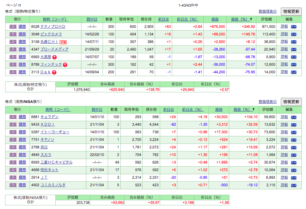 テクノプロHD(6028)はしばらく3,500円を上限にしたレンジが続いていたのですが、今月は大きく下落。3,000円以下の水準となっています。基本、ほったらかしにして、毎年配当金を受領していますが、ここまで大きく下がるとは思っていませんでした。相変わらずテクノプロの株価が左右する現物株ですね。