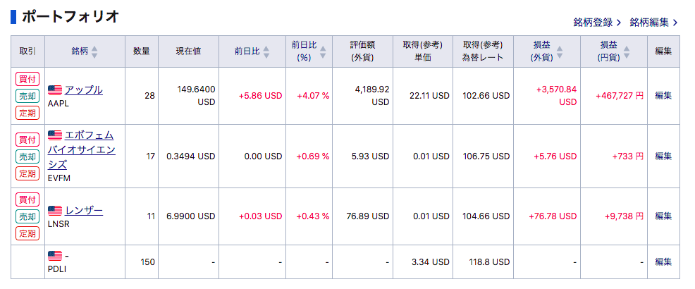 マネックス証券での保有しているものはPDLI BIOPHARMA(PDLI)、EVOFEM BIOSCIENCES(EVFM)、LENSAR Inc(LNSR)の3銘柄です。PDLIは上場廃止となり、何も出来ない状態ですが、先日配当金を受領しました。上場廃止となり、一般口座で保有しているので、何かと面倒な印象です。