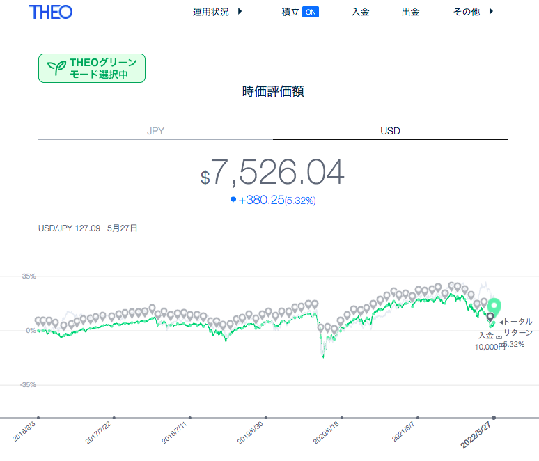 THEOもドル建て、円建ていずれも今月はマイナス推移です。THEO資産は一時100万円の大台を突破していたんですが、月末時点ではまた95万円ほどで推移しています。