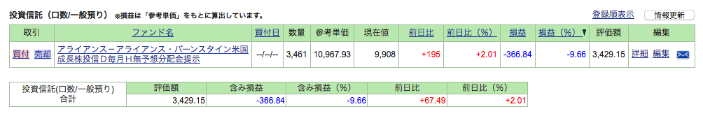 Tポイント投資のeMAXIS Slim米国株式(S&P500)はしっかりと含み益で推移していますが、楽天スーパーポイントでも購入しているAB米国成長株投資D毎月H無予想提示は、当初の目論見からはだいぶ当てが外れ、今月も配当金が受け取れないという結果になりました。