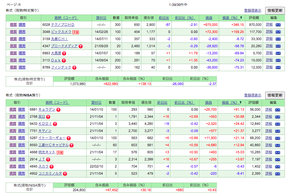 テクノプロHD(6028)は前回と比べると400円のマイナス。ここが一番影響が大きいです。あと一歩で評価額100万円ってところだったのに。