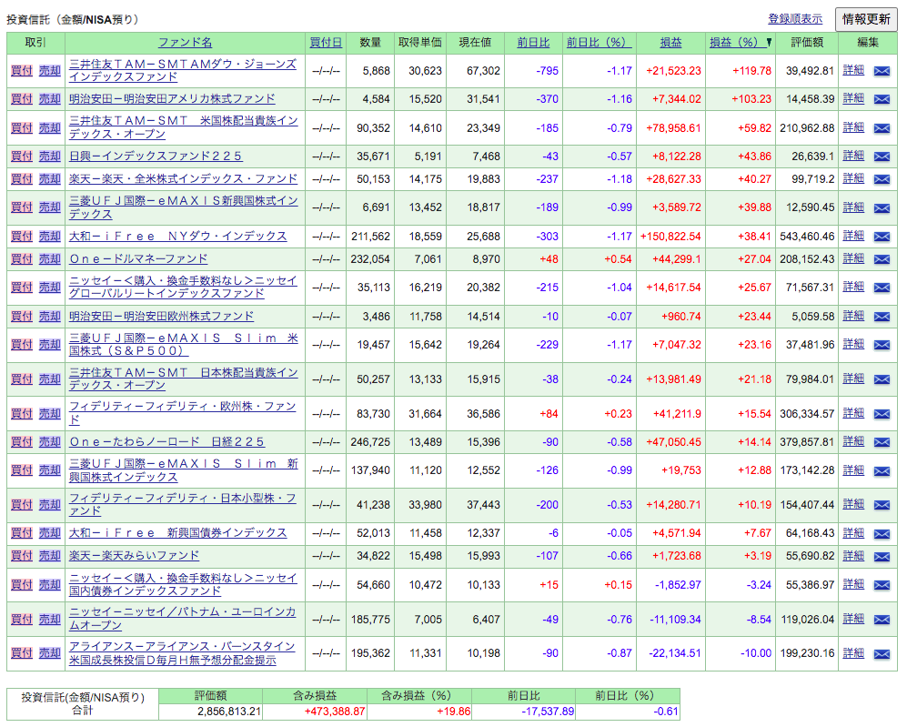 国内、欧米、新興国の株式型、債券型、先進国リート型、ヘッジファンド型そして日米の配当貴族インデックスの14銘柄をコツコツ積み立てています。毎月のコツコツ積み立てに加え、コストが高めだった旧積立銘柄の3年計画の定期売却はもう少しだけ続きそうです。