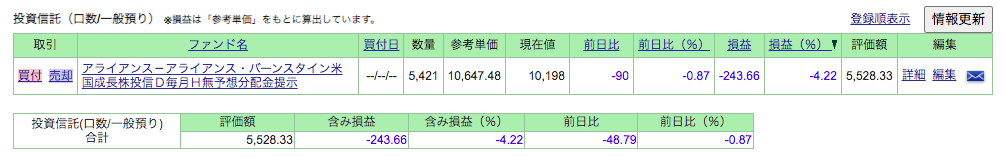配当貴族シリーズは、引き続き米国株が59.82%に対して、日本株は21.18%と大きく差が開いたままです。ただ、米国株の下落に比べ、日本株の下落はそれほど大きな影響はありません。Tポイント投資のeMAXIS Slim米国株式(S&P500)は23%程に含み益を降らしています。楽天スーパーポイントでも購入しているAB米国成長株投資D毎月H無予想提示は、またしても△10%程で推移しています。