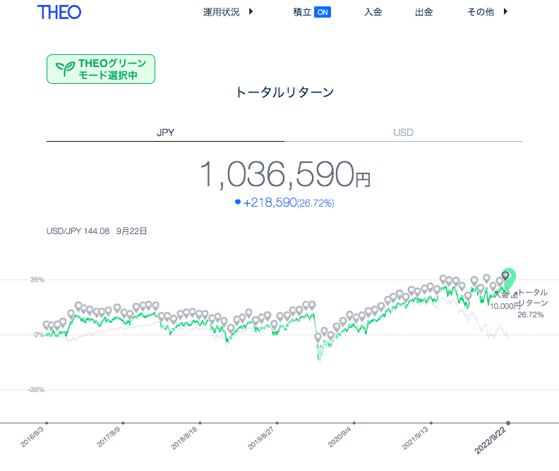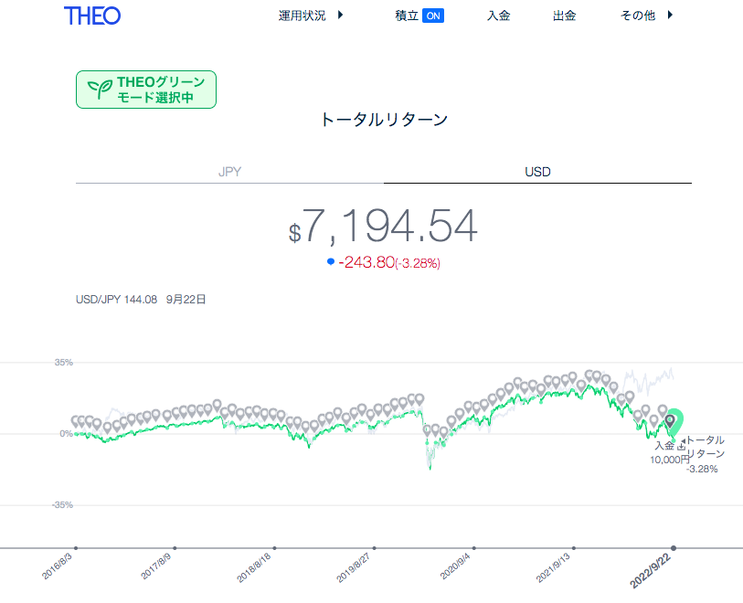 THEOもドル建て、円建ていずれもマイナス推移です。為替の影響が大きく、ドル建てに比べて円建てが大きくプラスになっています。円建てでは20%超えで推移していますが、ドル建てではついにマイ転。円安の影響でプラスに推移していますね。外貨建てを保有している人にはこの円安は追い風です。