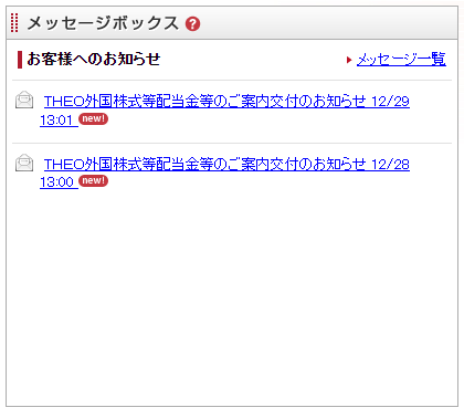 THEOグリーンモードにより新たに購入された銘柄(NULV、NULG、NUMG等)の分配金の件ですが、12月受領分の案内がまだ来ていないようです。
