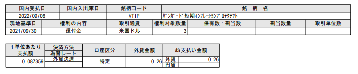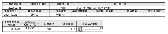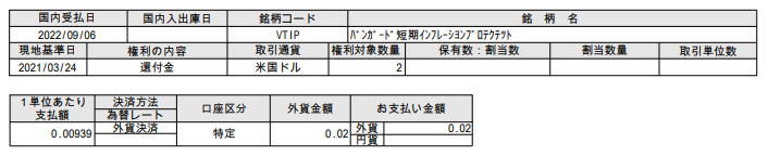 前回の配当税還付は2021年4月に受領していましたが、この際にはいつもの分配金の受領と同じように申告レートの記載、円建てでの配当金、外国源泉徴収税額の欄がありましたが、今回はお支払金額としての外貨金額のみとなっています。