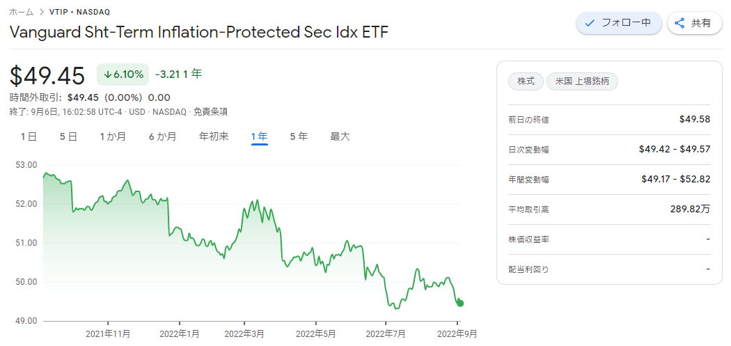 VTIPはインフレヘッジセクターで、米国の1-5年の物価連動国債のETFです。
