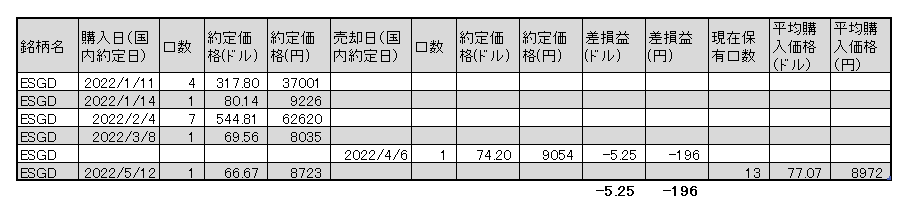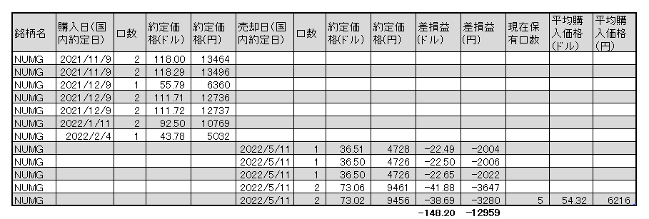 こちらは昨年11月から保有している銘柄になります。2月までは地道にコツコツ積み立てを継続していましたが、しばらく動きのない状態が続きました。今回は一気に5つの明細に分かれて7口の売却となります。11月から高い価格で購入をしていたんですね、軒並み全て損切りとなっています。なかなか大きな損切りとなっていますが、挽回できるんでしょうか・・・。